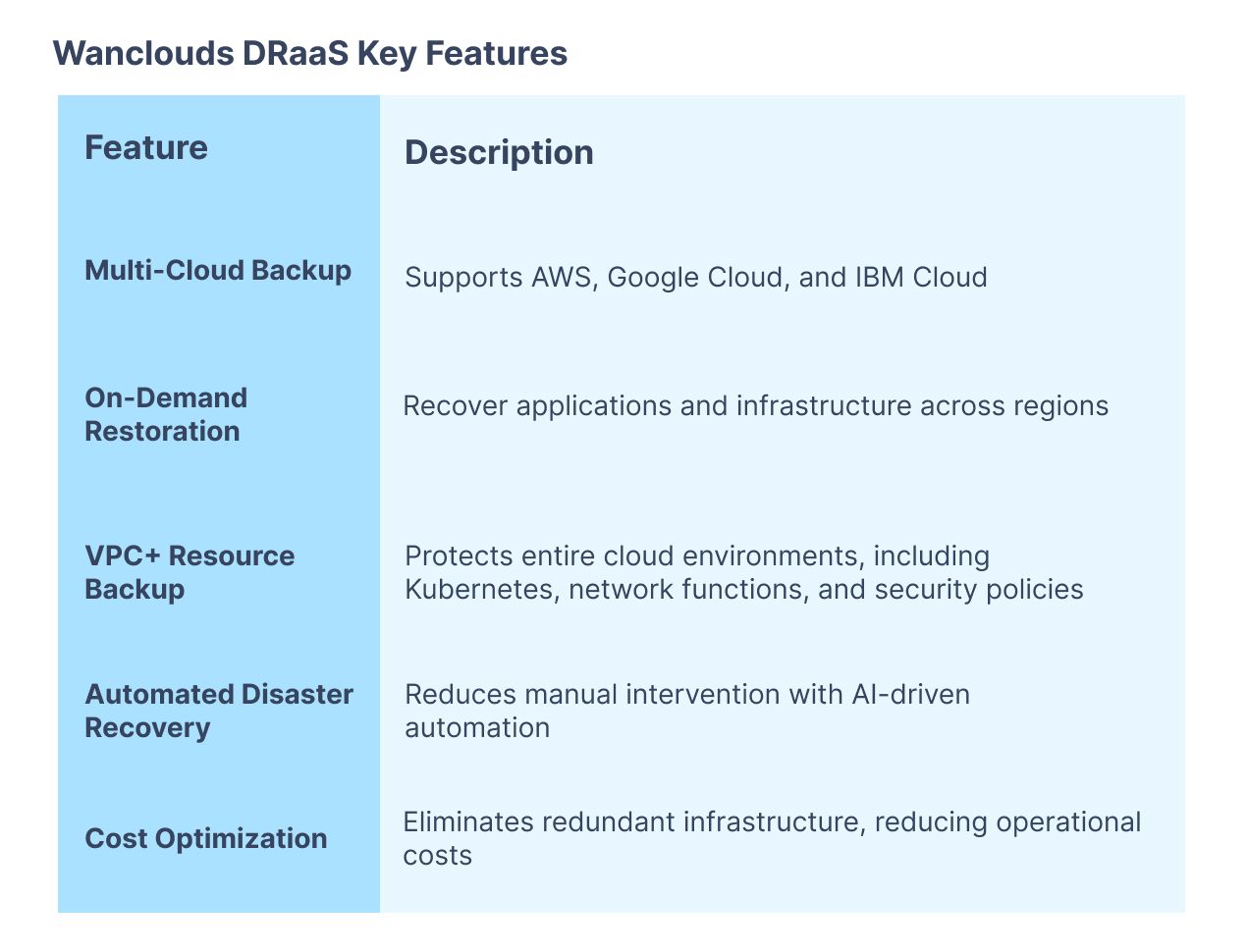 Wanclouds provides a robust Disaster Recovery as a Service (DRaaS) solution, allowing businesses to backup and restore data across multiple cloud providers. Powered by VPC+, our centralized DR solution offers: